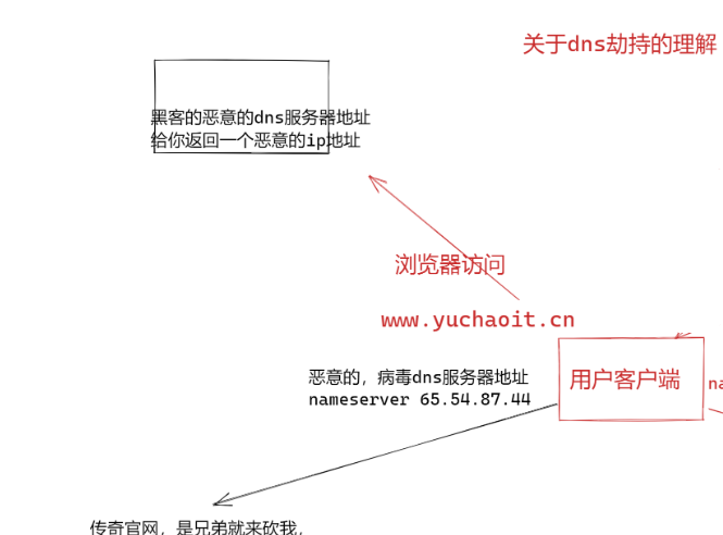 现在,假设作为客户端的Linux机器中毒了,resolv.conf文件被修改 为一个恶意dns服务器ip地址。恶意dns服务器把正当网页解析为一个恶意ip,把这个ip交还给客户端。最终客户端拿着一个恶意ip,最终访问恶意网站。