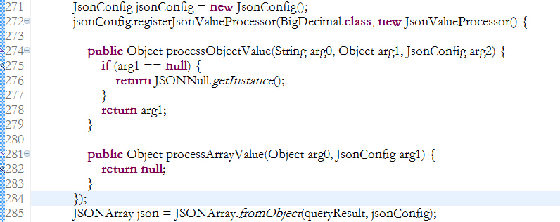 在json-lib中,我们使用JSONSerializer.toJSON(list, jsonConfig)、JSONArray.fromObject生成JSON字符串输出到前端页面,经常会遇到数据库为null但前端页面显示为0的情况。解决此问题,只需对值进行处理即可,以BigDecimal为例,代码如下:
