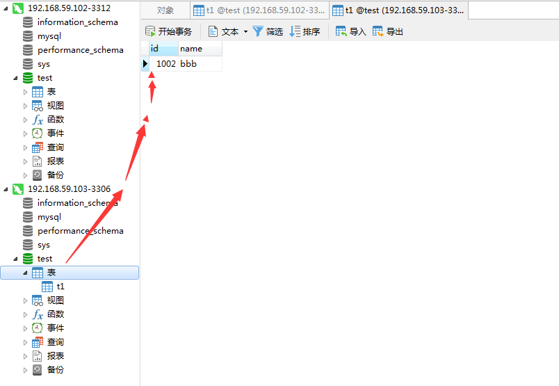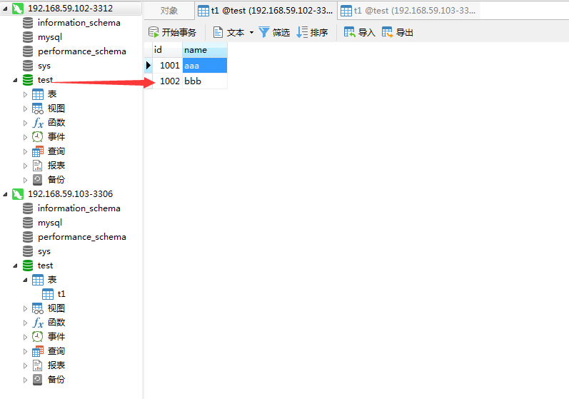 验证:(192.168.59.102和192.168.59.103需要同步的数据库.表要一样的结构)