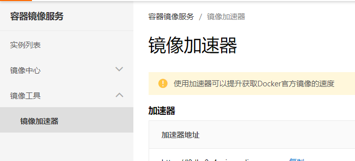 阿里云镜像加速器地址:控制台->产品与服务->容器镜像服务->镜像工具->镜像加速器