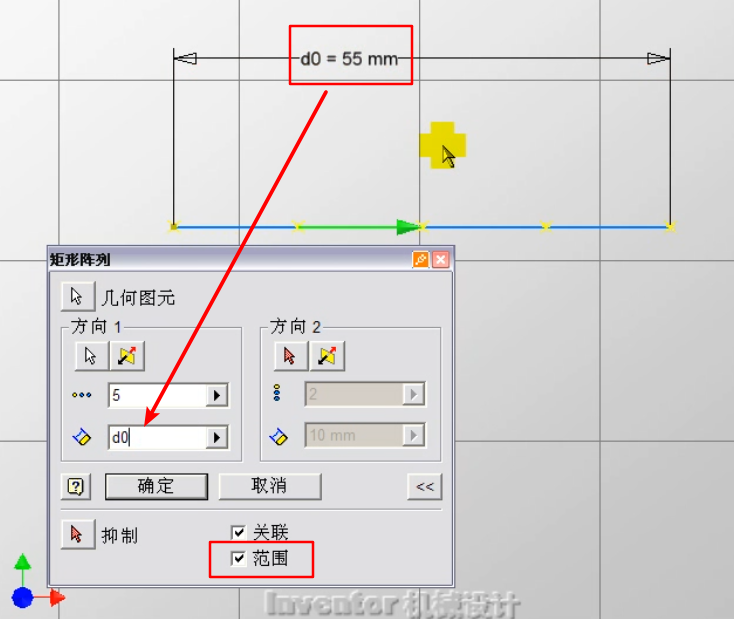 阵列的尺寸既可以是直接相邻两个元素的距离,也可以是在整个范围内阵列,总