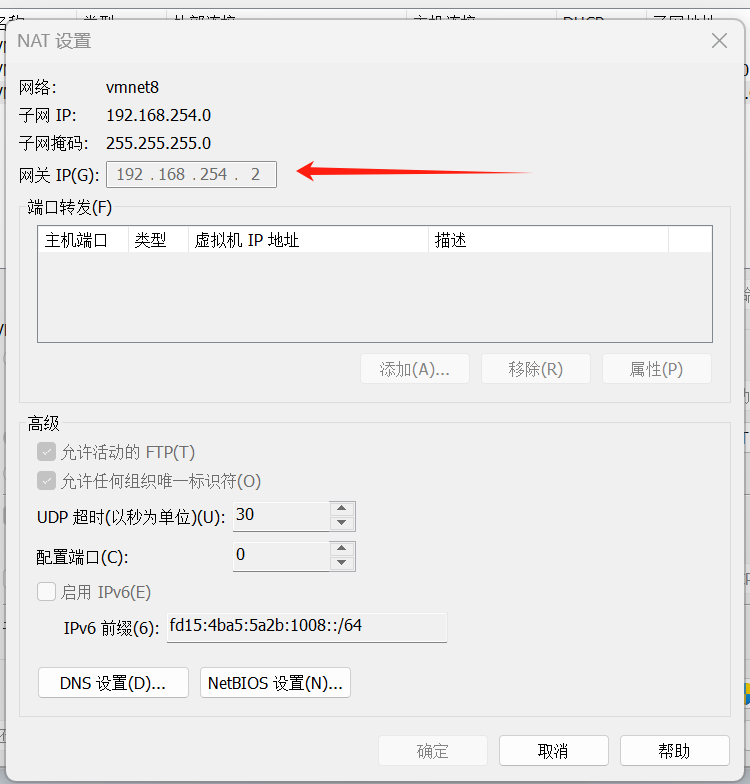 2、然后找到VMnet8,下面就是你的子网IP和子网掩码,然后点击net设置,就会出现你的网关IP,这个要记住