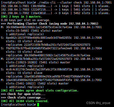 [root@localhost bin]# ./redis-cli -h 192.168.84.1 -p 7001 cluster nodes 8ae862c1815ff89e49d6c8801ea0cb074e82855c 192.168.84.1:7006@17006 slave 222df2165b7b9dba291cfa572d472ad292637873 0 1694427906290 3 connected f6df82f6c67fbe83049d6f95a8473221afee2ee6 192.168.84.1:7004@17004 slave 30c69d9e408015082c1a2145875cd1ec0c7a41ea 0 1694427905000 1 connected 222df2165b7b9dba291cfa572d472ad292637873 192.168.84.1:7003@17003 master - 0 1694427904000 3 connected 10923-16383 4cdc4c8127dc5ea8d15a239fa6c2f3c09b0d5f3a 192.168.84.1:7005@17005 slave 10a4381d9869e293cad95bf75482f506de9f43fe 0 1694427905255 2 connected 30c69d9e408015082c1a2145875cd1ec0c7a41ea 192.168.84.1:7001@17001 myself,master - 0 1694427902000 1 connected 0-5460 10a4381d9869e293cad95bf75482f506de9f43fe 192.168.84.1:7002@17002 master - 0 1694427902000 2 connected 5461-10922