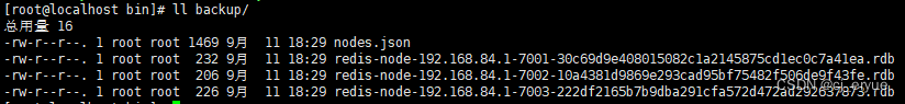 [root@localhost bin]# mkdir backup [root@localhost bin]# ./redis-cli --cluster backup 192.168.84.1:7001 ./backup >>> Performing Cluster Check (using node 192.168.84.1:7001) M: 30c69d9e408015082c1a2145875cd1ec0c7a41ea 192.168.84.1:7001 slots:[0-5460] (5461 slots) master 1 additional replica(s) S: 8ae862c1815ff89e49d6c8801ea0cb074e82855c 192.168.84.1:7006 slots: (0 slots) slave replicates 222df2165b7b9dba291cfa572d472ad292637873 S: f6df82f6c67fbe83049d6f95a8473221afee2ee6 192.168.84.1:7004 slots: (0 slots) slave replicates 30c69d9e408015082c1a2145875cd1ec0c7a41ea M: 222df2165b7b9dba291cfa572d472ad292637873 192.168.84.1:7003 slots:[10923-16383] (5461 slots) master 1 additional replica(s) S: 4cdc4c8127dc5ea8d15a239fa6c2f3c09b0d5f3a 192.168.84.1:7005 slots: (0 slots) slave replicates 10a4381d9869e293cad95bf75482f506de9f43fe M: 10a4381d9869e293cad95bf75482f506de9f43fe 192.168.84.1:7002 slots:[5461-10922] (5462 slots) master 1 additional replica(s) [OK] All nodes agree about slots configuration. >>> Check for open slots... >>> Check slots coverage... [OK] All 16384 slots covered. >>> Node 192.168.84.1:7001 -> Saving RDB... SYNC sent to master, writing 232 bytes to './backup/redis-node-192.168.84.1-7001-30c69d9e408015082c1a2145875cd1ec0c7a41ea.rdb' Transfer finished with success. >>> Node 192.168.84.1:7003 -> Saving RDB... SYNC sent to master, writing 226 bytes to './backup/redis-node-192.168.84.1-7003-222df2165b7b9dba291cfa572d472ad292637873.rdb' Transfer finished with success. >>> Node 192.168.84.1:7002 -> Saving RDB... SYNC sent to master, writing 206 bytes to './backup/redis-node-192.168.84.1-7002-10a4381d9869e293cad95bf75482f506de9f43fe.rdb' Transfer finished with success. Saving cluster configuration to: ./backup/nodes.json [OK] Backup created into: ./backup