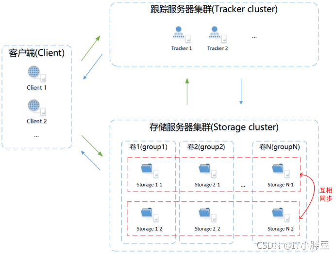 FastDFS系统由跟踪服务器(Tracker server)、存储服务器(Storage server)和客户端(Client)构成。