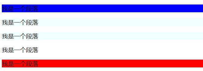 <!DOCTYPE html> <html> <head> <meta charset="utf-8"> <title>属性选择器</title> <style type="text/css"> /* 属性选择器: 作用: 可以根据元素中的属性或属性值来选取指定元素 语法: [属性名] 选取含有指定属性的元素 [属性名="属性名"] 选取含有指定属性值的元素 [属性名^="属性值"] 选取属性值以指定内容开头的元素 [属性名$="属性值"] 选取属性值以指定内容结尾的元素 [属性名*="属性值"] 选取属性值以包含指定内容的元素 */ p[title]{ background-color: red; } /* [属性名="属性名"] 选取含有指定属性值的元素 */ p[title="hello"]{ background-color: blue; } /* [属性名^="属性值"] 选取属性值以指定内容开头的元素 */ p[title^="ab"]{ background-color: #7FFF00; } /* [属性名$="属性值"] 选取属性值以指定内容结尾的元素 */ p[title$="c"]{ background-color: #FF8C00; } /* [属性名*="属性值"] 选取属性值以包含指定内容的元素 */ p[title*="a"]{ background-color: azure; } </style> </head> <body> <!-- title属性,这个属性可以给任何标签指定 当鼠标移动到元素上时,元素中的title属性的值将会作为提示文字显示 --> <p title="hello">我是一个段落</p> <p title="adc">我是一个段落</p> <p title="abd">我是一个段落</p> <p>我是一个段落</p> <p title="bye">我是一个段落</p> </body> </html>