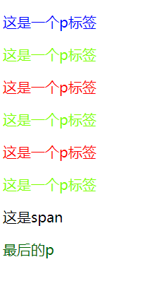 <!DOCTYPE html> <html> <head> <meta charset="utf-8"> <title>子元素的伪类</title> <style type="text/css"> /* :first-child -选择第一个子标签 :last-child -选择最后一个子标签. :nth-child( ) 该选择器后面可以指定一个参数,指定要选中的第几个子元素 even 表示偶数位置的子元素 :nth-child(even) odd 表示基数位置的子元素 :nth-child(odd) -选择指定位置的子元素 :first-of-type :last-of-type :nth-of-type 和:first-child这些非常类似 只不过child,是在所有的子元素中排列 而type是在当前类型的子元素中排列 -选择指定类型的子元素 */ body>p:first-child { color: blue; } body>p:last-child { color: yellow; } p:nth-child(even) { color: #7FFF00; } p:nth-child(odd) { color: #FF0000; } p:last-of-type { color: darkgreen; } </style> </head> <body> <p>这是一个p标签</p> <p>这是一个p标签</p> <p>这是一个p标签</p> <p>这是一个p标签</p> <p>这是一个p标签</p> <p>这是一个p标签</p> <span>这是span</span> <p>最后的p</p> </body> </html>