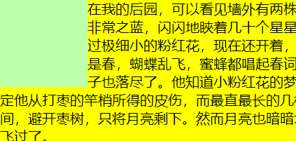 <!DOCTYPE html> <html> <head> <meta charset="UTF-8"> <title></title> <style type="text/css"> *{ margin: 0; padding: 0; } .box1{ width: 100px; height: 100px; background-color: #bfa; /* * 浮动的元素不会盖住文字,文字会自动环绕在浮动元素的周围, * 所以我们可以通过浮动来设置文字环绕图片的效果 */ /*box1向左浮动*/ float: left; } .p1{ background-color: yellow; } </style> </head> <body> <div class="box1"></div> <p class="p1"> 在我的后园,可以看见墙外有两株树,一株是枣树,还有一株也是枣树。 这上面的夜的天空,奇怪而高,我生平没有见过这样奇怪而高的天空。他仿佛要离开人间而去,使人们仰面不再看见。然而现在却非常之蓝,闪闪地䀹着几十个星星的眼,冷眼。他的口角上现出微笑,似乎自以为大有深意,而将繁霜洒在我的园里的野花草上。 我不知道那些花草真叫什么名字,人们叫他们什么名字。我记得有一种开过极细小的粉红花,现在还开着,但是更极细小了,她在冷的夜气中,瑟缩地做梦,梦见春的到来,梦见秋的到来,梦见瘦的诗人将眼泪擦在她最末的花瓣上,告诉她秋虽然来,冬虽然来,而此后接着还是春,蝴蝶乱飞,蜜蜂都唱起春词来了。她于是一笑,虽然颜色冻得红惨惨地,仍然瑟缩着。 枣树,他们简直落尽了叶子。先前,还有一两个孩子来打他们,别人打剩的枣子,现在是一个也不剩了,连叶子也落尽了。他知道小粉红花的梦,秋后要有春;他也知道落叶的梦,春后还是秋。他简直落尽叶子,单剩干子,然而脱了当初满树是果实和叶子时候的弧形,欠伸得很舒服。但是,有几枝还低亚着,护定他从打枣的竿梢所得的皮伤,而最直最长的几枝,却已默默地铁似的直刺着奇怪而高的天空,使天空闪闪地鬼䀹眼;直刺着天空中圆满的月亮,使月亮窘得发白。 鬼䀹眼的天空越加非常之蓝,不安了,仿佛想离去人间,避开枣树,只将月亮剩下。然而月亮也暗暗地躲到东边去了。而一无所有的干子,却仍然默默地铁似的直刺着奇怪而高的天空,一意要制他的死命,不管他各式各样地䀹着许多蛊惑的眼睛。 哇的一声,夜游的恶鸟飞过了。 </p> </body> </html>