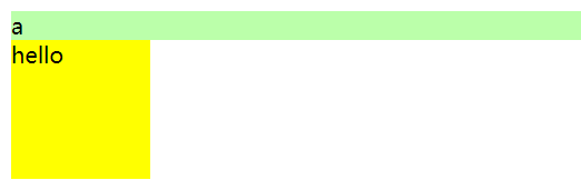 <!DOCTYPE html> <html> <head> <meta charset="UTF-8"> <title></title> <style type="text/css"> .box1{ /* * 在文档流中,子元素的宽度默认占父元素的全部 */ background-color: #bfa; /* * 当元素设置浮动以后,会完全脱离文档流. * 块元素脱离文档流以后,高度和宽度都被内容撑开 */ /*float: left;*/ } .s1{ /* * 开启span的浮动 * 内联元素脱离文档流以后会变成块元素 */ float: left; width: 100px; height: 100px; background-color: yellow; } </style> </head> <body> <div class="box1">a</div> <span class="s1">hello</span> </body> </html>