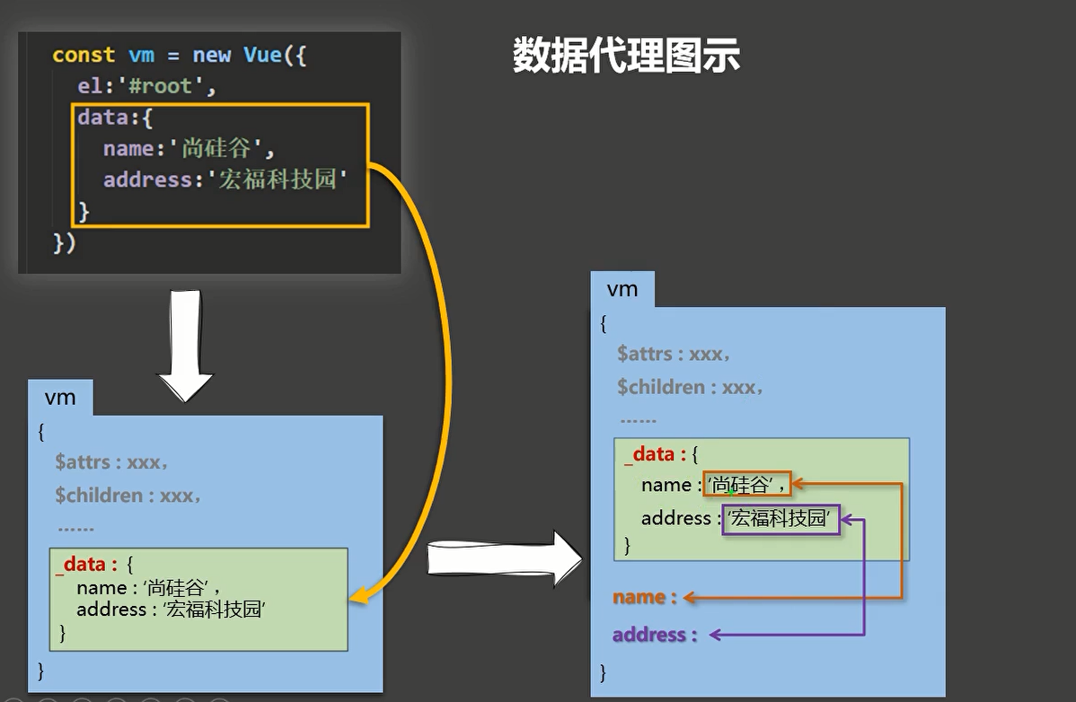 <!DOCTYPE html> <html> <head> <meta charset="UTF-8" /> <title>Vue中的数据代理</title> <!-- 引入Vue --> <script type="text/javascript" src="../js/vue.js"></script> </head> <body> <!-- 1.Vue中的数据代理: 通过vm对象来代理data对象中属性的操作(读/写) 2.Vue中数据代理的好处: 更加方便的操作data中的数据 3.基本原理: 通过Object.defineProperty()把data对象中所有属性添加到vm上。 为每一个添加到vm上的属性,都指定一个getter/setter。 在getter/setter内部去操作(读/写)data中对应的属性。 --> <!-- 准备好一个容器--> <div id="root"> <h2>学校名称:{{name}}</h2> <h2>学校地址:{{address}}</h2> </div> </body> <script type="text/javascript"> Vue.config.productionTip = false //阻止 vue 在启动时生成生产提示。 const vm = new Vue({ el:'#root', data:{ name:'尚硅谷', address:'宏福科技园' } }) </script> </html>