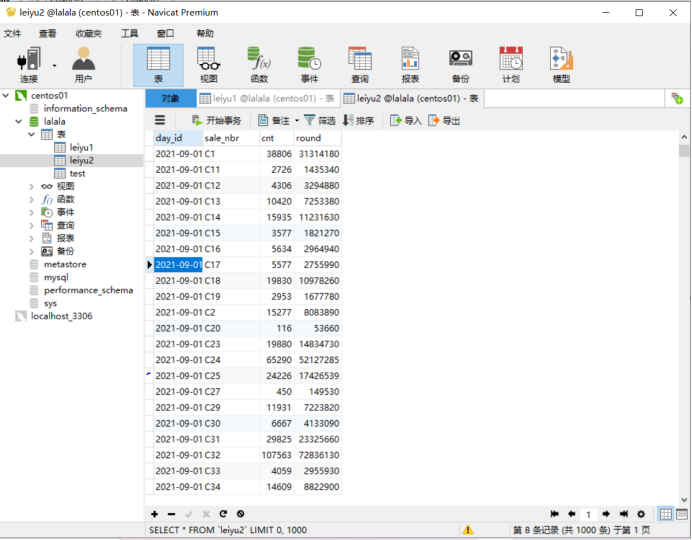 create table daiout as select day_id as day_id,sale_nbr as sale_nbr,sum(cnt)as cnt,sum(round)as round from leilei where sale_nbr like 'O%' group by day_id,sale_nbr;