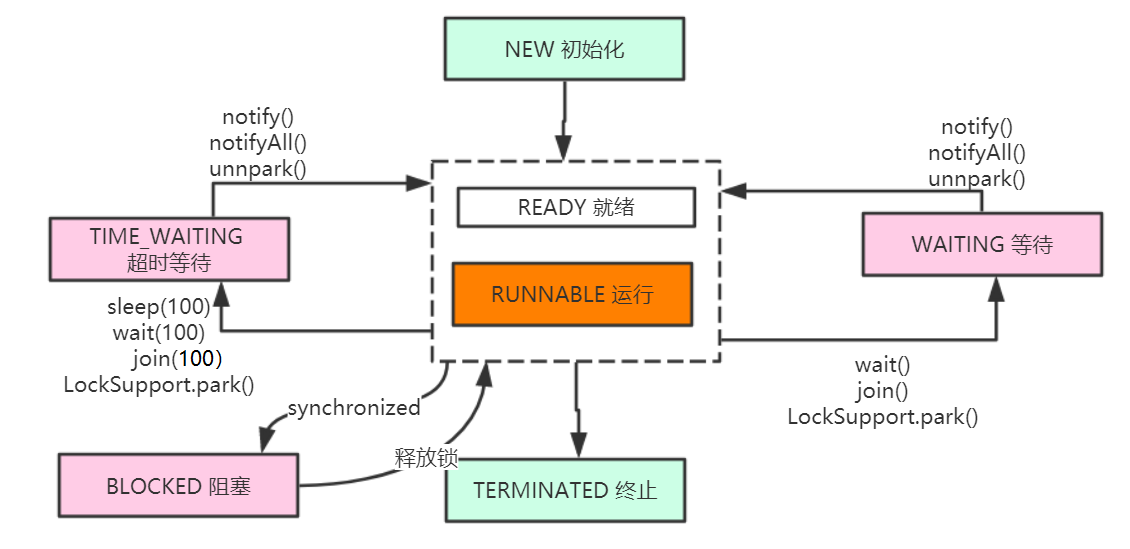 与 WAITING 状态类似,都是等待状态,区别在于处于该状态的线程不会无限的等待,如果线程没有在指定的时间范围内完成期望的操作,该线程自动转换为 RUNNABLE;