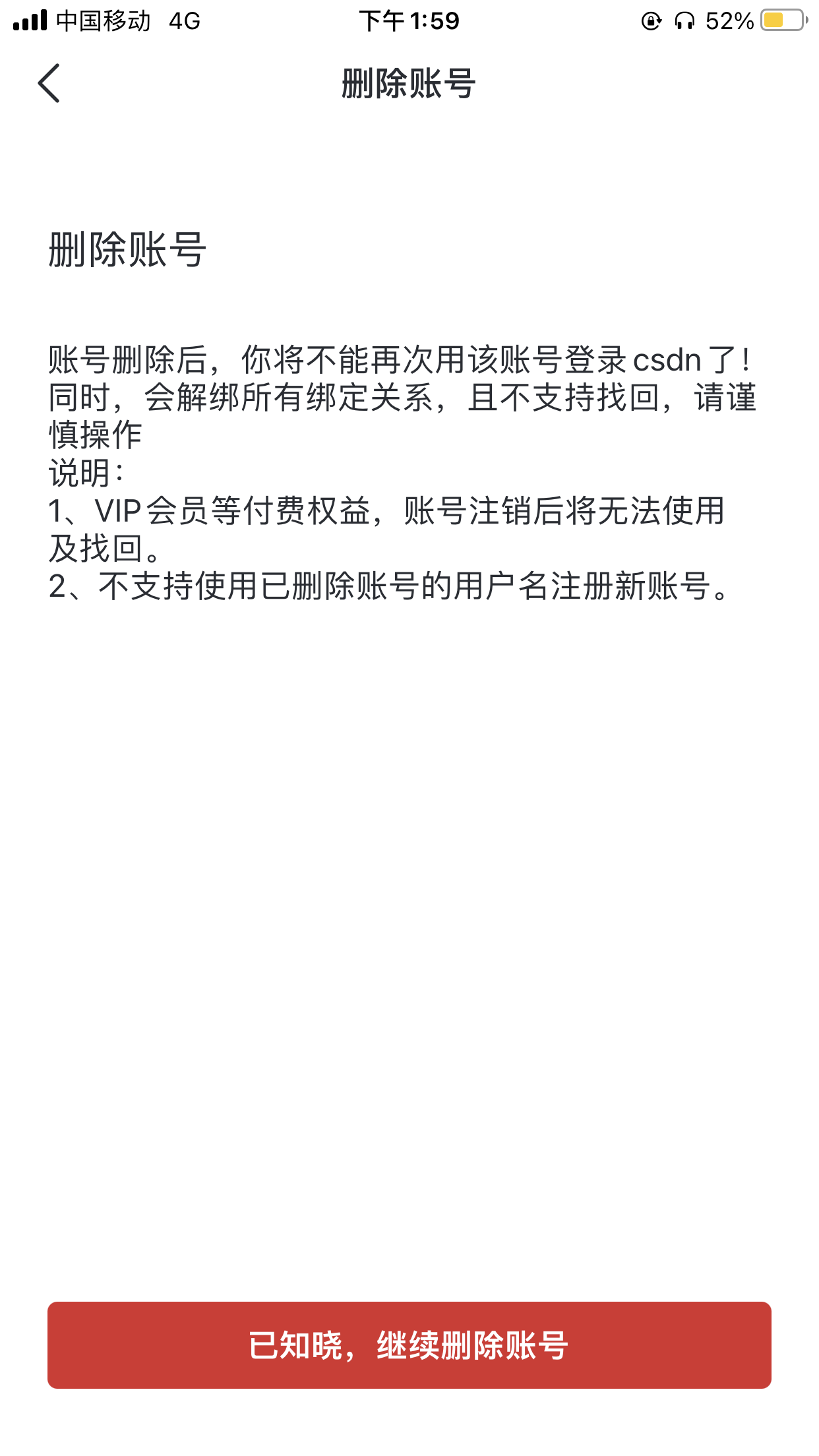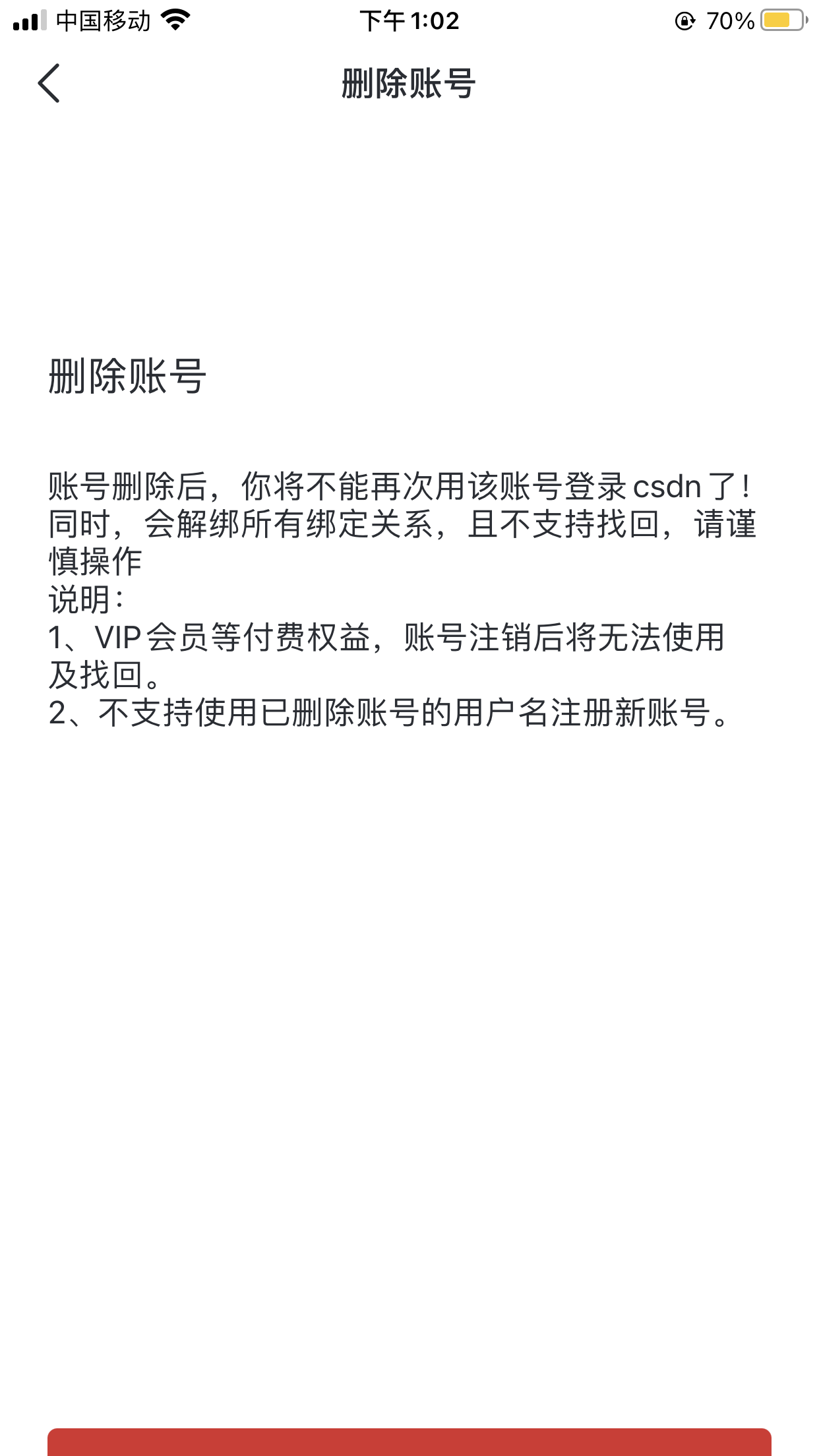 在CSDN移动端账号与安全中点击删除账号后进入说明界面后偶尔无法完全显示下方红色按钮的全部内容,但是点击红色按钮可以正常跳出确认删除的界面。