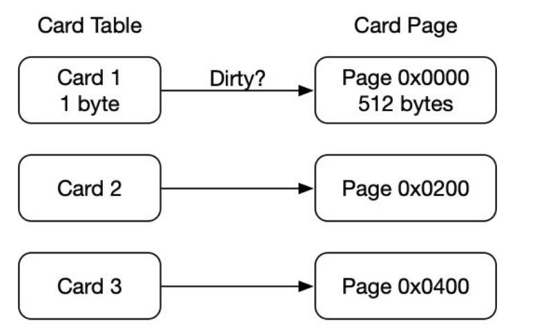 一个卡页中可包含多个对象,只要有一个对象的字段存在跨代指针,其对应的卡表的元素标识就变成1,表示该元素变脏,否则为0.
