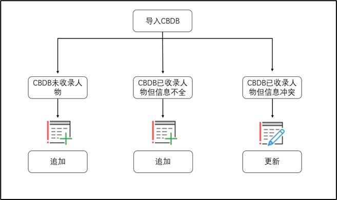 对于这三种不同的情况,我们选择三种不同的方法。对第1种情况,我们将其追加在表格中,同时为其创建新的人物代码;对于第2种情况,需要在核对人物身份之后,将其追加在相对应实体之中;对于第三种情况,我们需要通过其他资料的实证来分辨是否为讹误,在确定属实之后,我们可以通过更新表来实现对CBDB中数据的改正。(如下图示意)