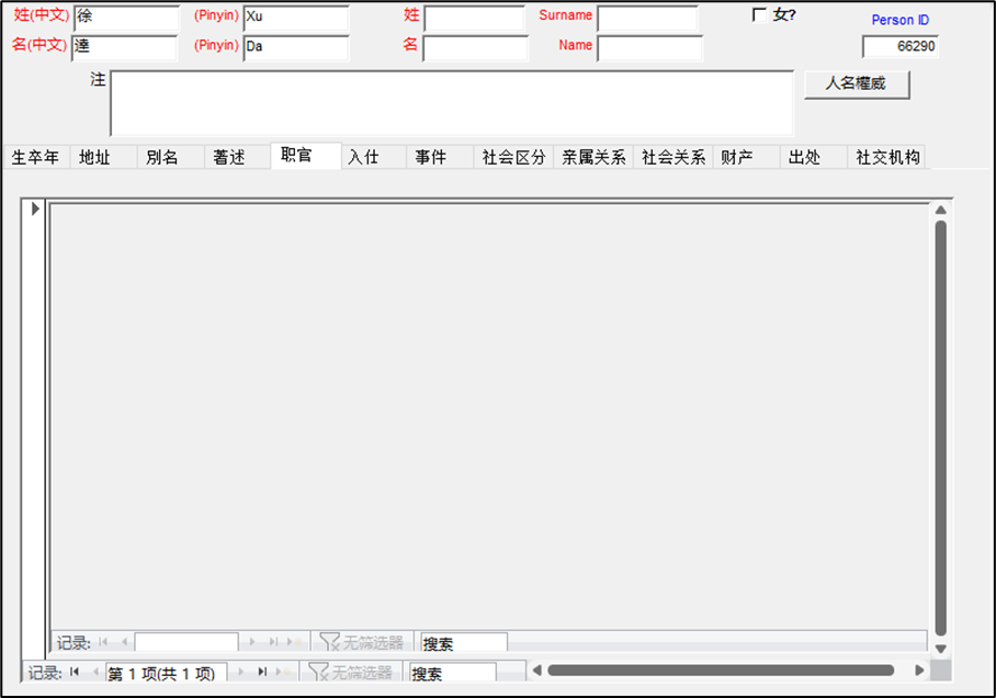 实际上,通过我们的对比,发现在CBDB中除了缺少人物,关于人物的大量数据都是处于空白状态。此处,以徐达为例,在CBDB中,按人查询时,我们发现徐达的职官一栏中为空,这是由于CBDB未收录徐达的职官信息,因此也就无法显示。
