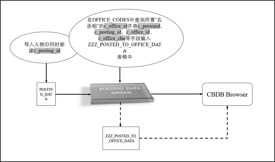 通过查询窗体的代码,我绘制出查询人物的职官信息的基本流程,并且根据该流程实现了数据导入后的可查询。如下图所示,在CBDB的主页面(CBDB Browser)的数据来源于窗体POSTING_DATA Subform,而窗体POSTING_DATA Subform的数据则来源于表格POSTING_DATA但是由于需要显示人物的c_office_id、c_office_chn等字段,因此也需要对ZZZ_POSTED_TO_OFFICE_DATA表格进行更改。我们通过“为徐达添加一条‘右丞相’的职官记录为例”,介绍如何向CBDB中添加可查询的数据记录。