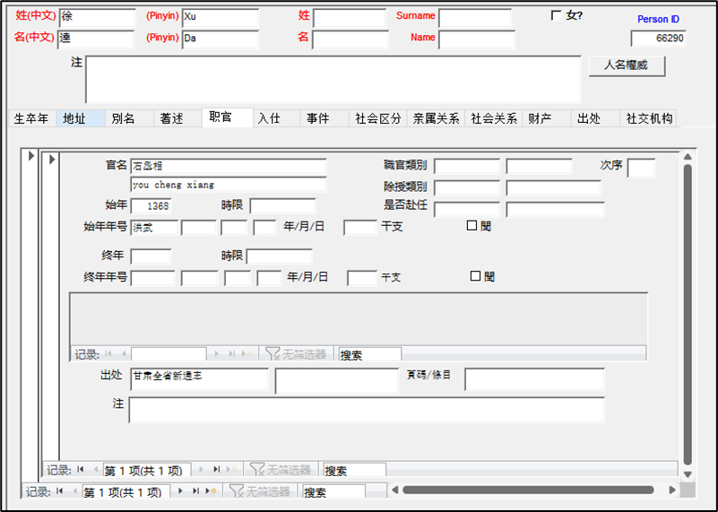 首先,查询得到徐达的人物ID:66290,在POSTING_DATA表格中为徐达添加一条授官记录,加入人物ID之后赋予新的c_posting_id,这就为徐达增加了一次授官的事件,这样在CBDB Browser查询徐达的职官情况时候通过窗体POSTING_DATA Subform可以得知徐达有一条授官的记录,但是由于没有添加具体授官的官职名称,因此,在结果中不会显示。为了让授官的事件附加有具体的职官等信息,我们还需要从表格OFFICE_CODES中找到“右丞相”的c_office_id等信息并将c_personid、c_posting_id、c_office_id、c_office_chn等字段输入ZZZ_POSTED_TO_OFFICE_DATA表格中。这样在查询的时候,既可以让电脑知道徐达曾被授官这一事件,还可以知道徐达被授予职官的具体信息。