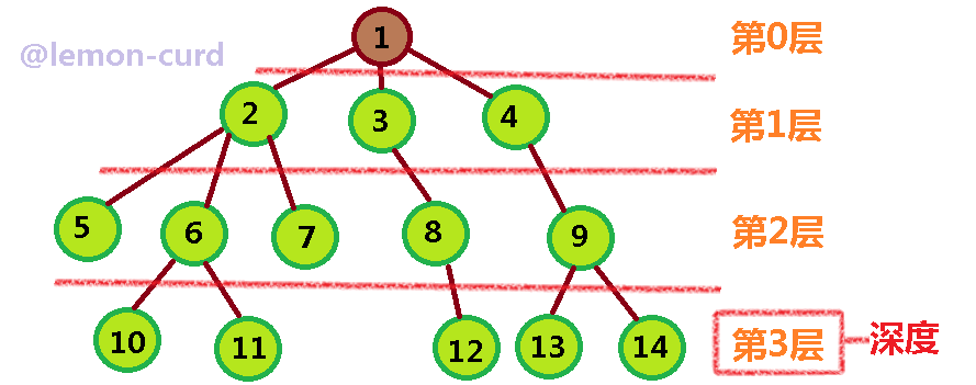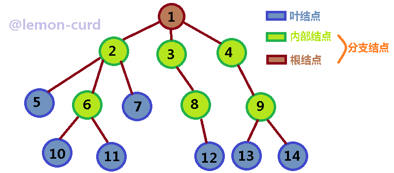 ④内部结点:包裹在根结点和叶结点中间的结点,也就是内部,去掉爸爸和垫底的球球,具体请看图与图例