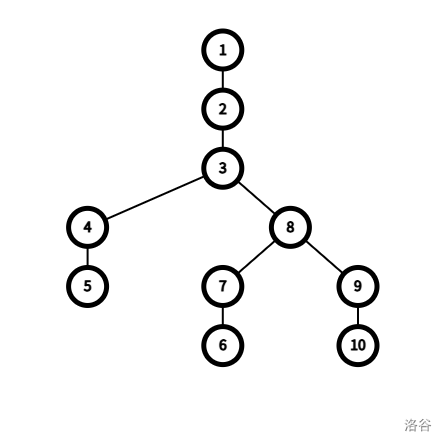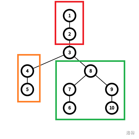 考虑到 3 号点是一个答案,我们以它为例研究,在下图中我标出了需要与 \(n/2\) 比较大小的子树。