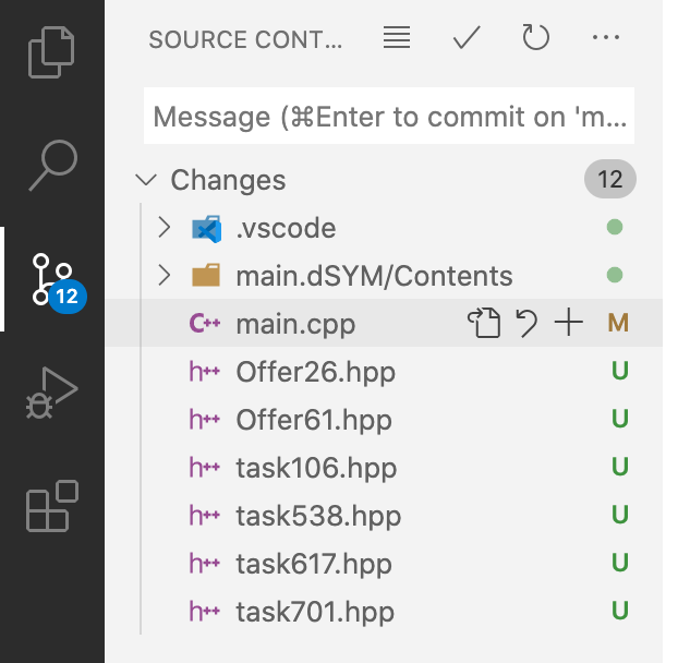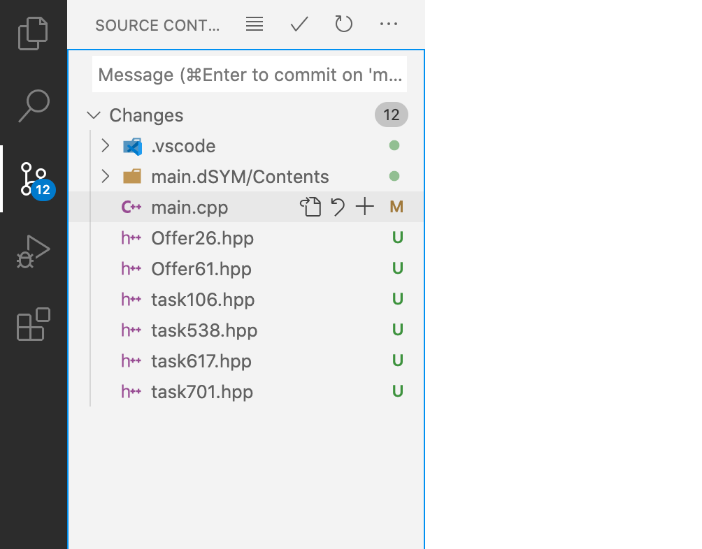 2.初始化完成后,我们可以查看工作区的状态在VSCode中以绿色U标记的文件为没有添加到版本库进行跟踪的文件(Untracked files)、以橙色M标记的文件为已修改(Modified)未提交的文件(Changes not staged for commit):