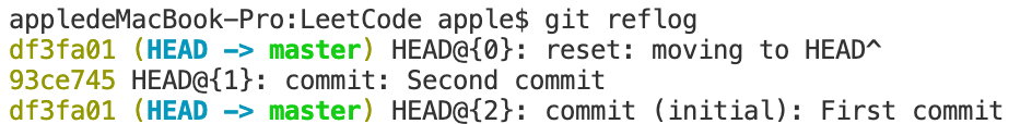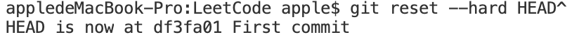 为了体现版本回退,我们再次提交一次“Second commit”,这个时候HEAD指针指向Second commit,执行git reset --hard HEAD^命令之后:回退到First commit
