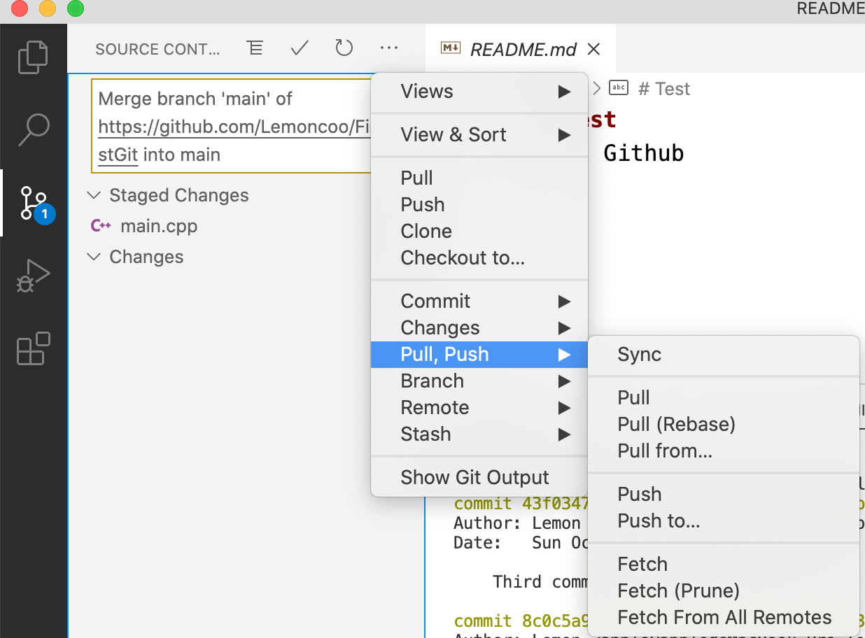 4.如果想要下载远程库中的内容可以通过使用git pull命令来完成该操作。同时VSCode自带了进行push和pull的操作: