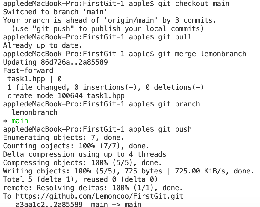 4.最后就能够进行分支合并的操作了:首先回到master分支,然后同步最新的远程版本库内容,最后将自己的分支合并到主分支上,就能够将自己的开发结果推送到远程版本库中了。这里将会用到git merge指令,将分支进行合并,下面是指令的执行顺序:
