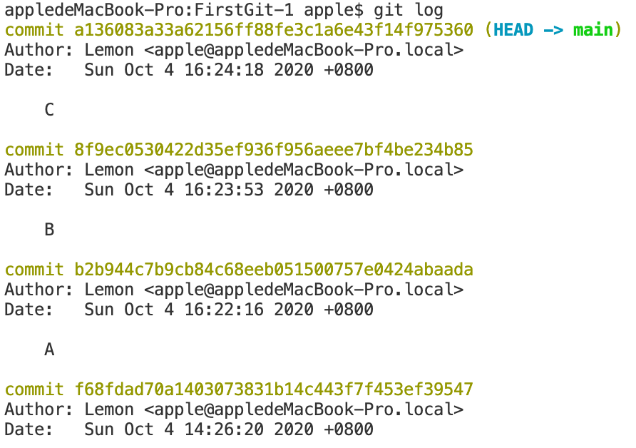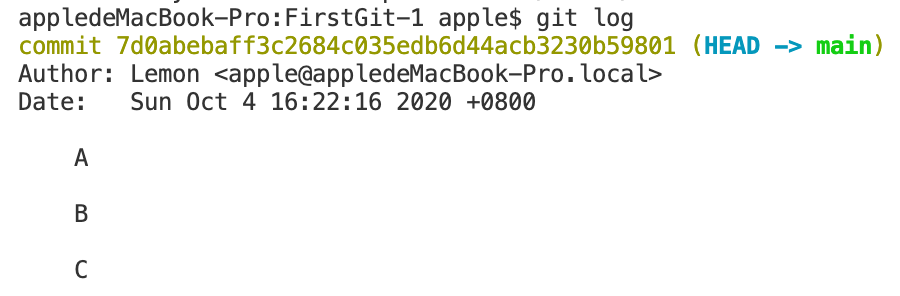 1.首先我们创建三个提交A,B,C,然后使用git log指令查看commit信息