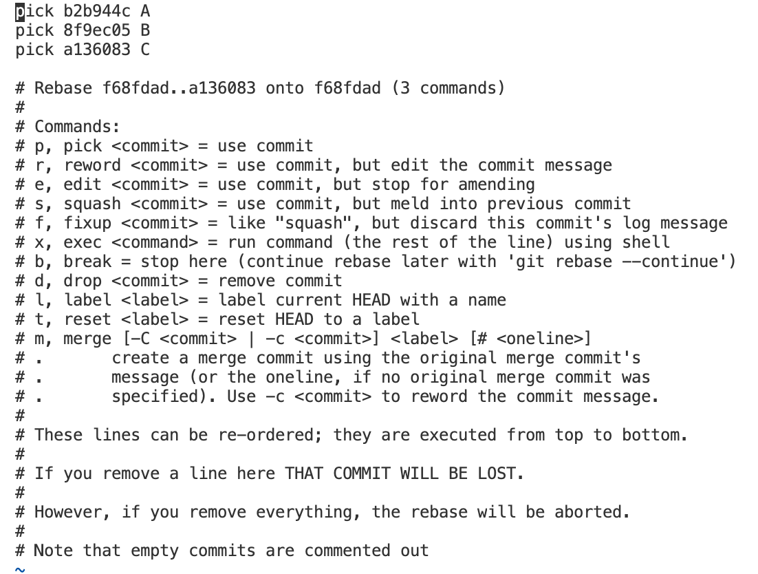 2.使用git rebase命令,进入编辑模式,界面如下: