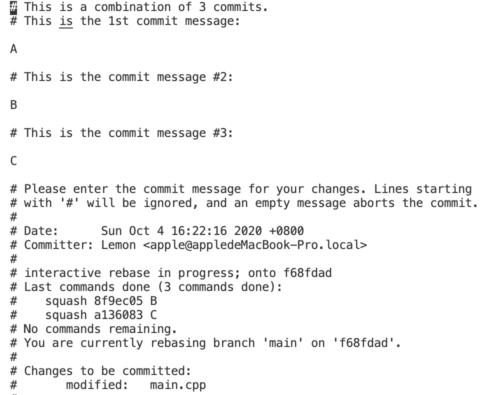 3.然后我们修改B与C,将pick改为S,意味与前一个commit合并,之后将会出现如下界面,在这个界面下可以修改注释信息: