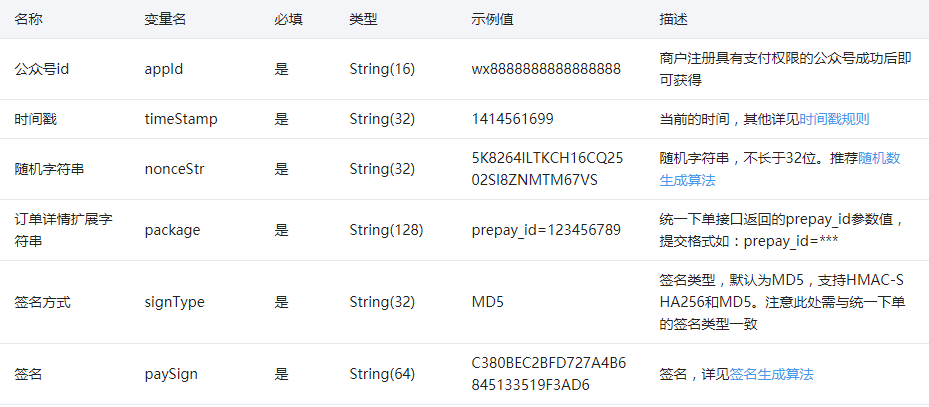 1、网页端接口请求参数列表(参数需要重新进行签名计算,参与签名的参数为:appId、timeStamp、nonceStr、package、signType,参数区分大小写。)