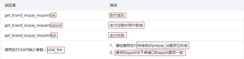 注:JS API的返回结果get_brand_wcpay_request:ok仅在用户成功完成支付时返回。由于前端交互复杂,get_brand_wcpay_request:cancel或者get_brand_wcpay_request:fail可以统一处理为用户遇到错误或者主动放弃,不必细化区分