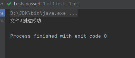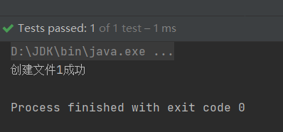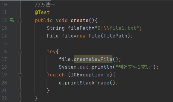 //方式1 @Test public void create1(){ String filePath = "D:\\file1.txt"; File file = new File(filePath); try { file.createNewFile(); System.out.println("创建文件1成功"); } catch (IOException e) { e.printStackTrace(); } }