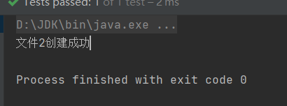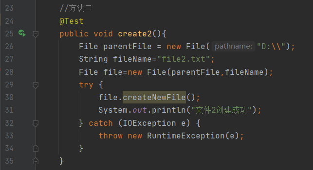 //方式2 @Test public void create2(){ File parentFile = new File("D:\\"); String fileNane = "file2.txt"; File file = new File(parentFile, fileNane); try { file.createNewFile(); System.out.println("文件2创建成功"); } catch (IOException e) { throw new RuntimeException(e); } }