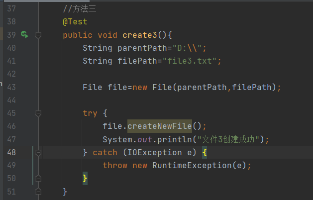 //方式三 @Test public void create3(){ String parentPath = "d:\\"; String filePath = "file3.txt"; File file = new File(parentPath, filePath); try { file.createNewFile(); System.out.println("文件3创建成功"); } catch (IOException e) { throw new RuntimeException(e); } }}