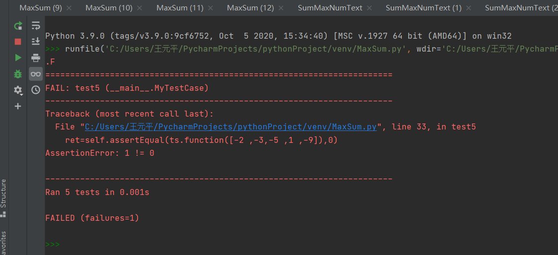 import unittest class MyTestCase(unittest.TestCase): def test_something(self): return self.assertEqual(True, False) def test1(self): ts = SumMaxNum() return self.assertEqual(ts.function([-2 ,6, -1, 5, 4, -7, 2, 3]),14) def test2(self): ts = SumMaxNum() return self.assertEqual(ts.function([1, 4, -5, 9, 8, 3, -6]),20) def test3(self): ts = SumMaxNum() return self.assertEqual(ts.function([-1 ,20 ,-5, 30 ,-4]),45) def test4(self): ts = SumMaxNum() return self.assertEqual(ts.function([-2 ,-3,-5 ,1 ,-9]),1) def test5(self):#这组故意设置错误的值 ts = SumMaxNum() return self.assertEqual(ts.function([-2 ,-3,-5 ,1 ,-9]),0) if __name__ == '__main__': suite = unittest.TestSuite() suite.addTest(MyTestCase('test1')) suite.addTest(MyTestCase('test2')) suite.addTest(MyTestCase('test3')) suite.addTest(MyTestCase('test4')) suite.addTest(MyTestCase('test5')) runner = unittest.TextTestRunner() runner.run(suite)