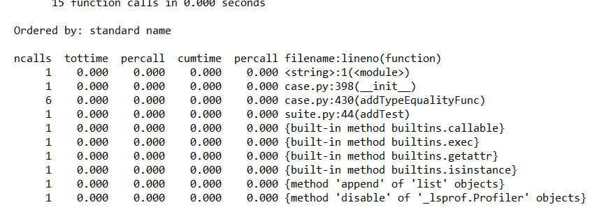 import cProfile cProfile.run("suite.addTest(MyTestCase('test1'))") cProfile.run("suite.addTest(MyTestCase('test2'))") cProfile.run("suite.addTest(MyTestCase('test3'))") cProfile.run("suite.addTest(MyTestCase('test4'))") cProfile.run("suite.addTest(MyTestCase('test5'))")