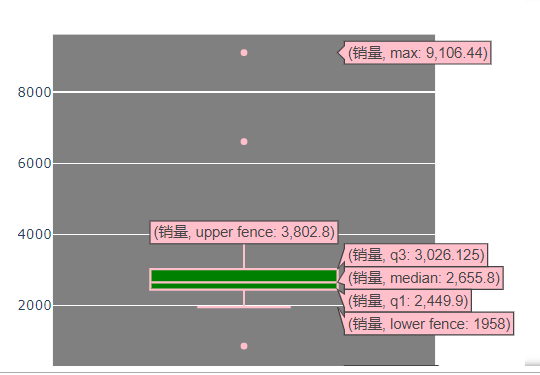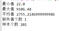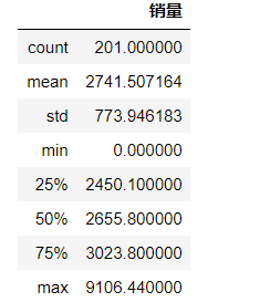 print('常用数据',data.describe(),end='\n') print('最小值',data['销量'].min(),end='\n') print('最大值',data['销量'].max(),end='\n') print('平均值',data['销量'].mean(),end='\n') print('缺失值个数',data['销量'].isnull().sum(),end='\n') print('样本个数',data['销量'].shape[0],end='\n')