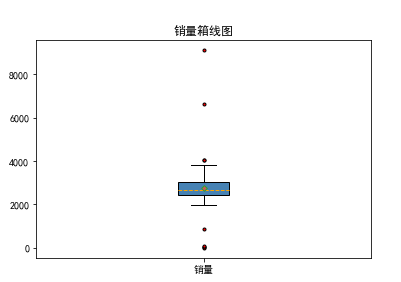 plt.rcParams['font.sans-serif'] = ['SimHei'] plt.rcParams['axes.unicode_minus'] = False plt.boxplot(x = data.销量, # 指定绘图数据 patch_artist=True, # 要求用自定义颜色填充盒形图,默认白色填充 showmeans=True, # 以点的形式显示均值 boxprops = {'color':'black','facecolor':'steelblue'}, # 设置箱体属性,如边框色和填充色 # 设置异常点属性,如点的形状、填充色和点的大小 flierprops = {'marker':'o','markerfacecolor':'red', 'markersize':3}, # 设置均值点的属性,如点的形状、填充色和点的大小 meanprops = {'marker':'D','markerfacecolor':'indianred', 'markersize':4}, # 设置中位数线的属性,如线的类型和颜色 medianprops = {'linestyle':'--','color':'orange'}, labels = ['销量'] ) # 添加图形标题 plt.title('销量箱线图') plt.show()
