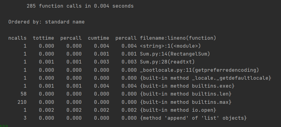 cProfile.run("SumMaxNum().RectangelSum(SumMaxNum().readtxt('a.txt'))")//测试效能