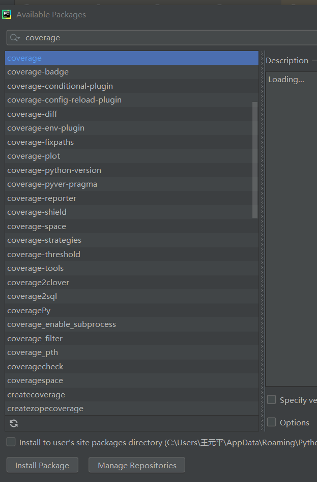 然后搜索coverage,然后install Package,便配置好了coverage。