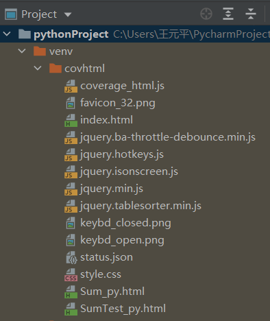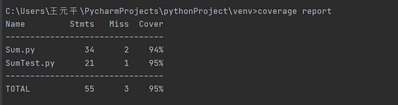 结果可以得知,执行的SumTest.py文件,代码覆盖率是95%,和上面的使用命令:coverage report查看报告一样。