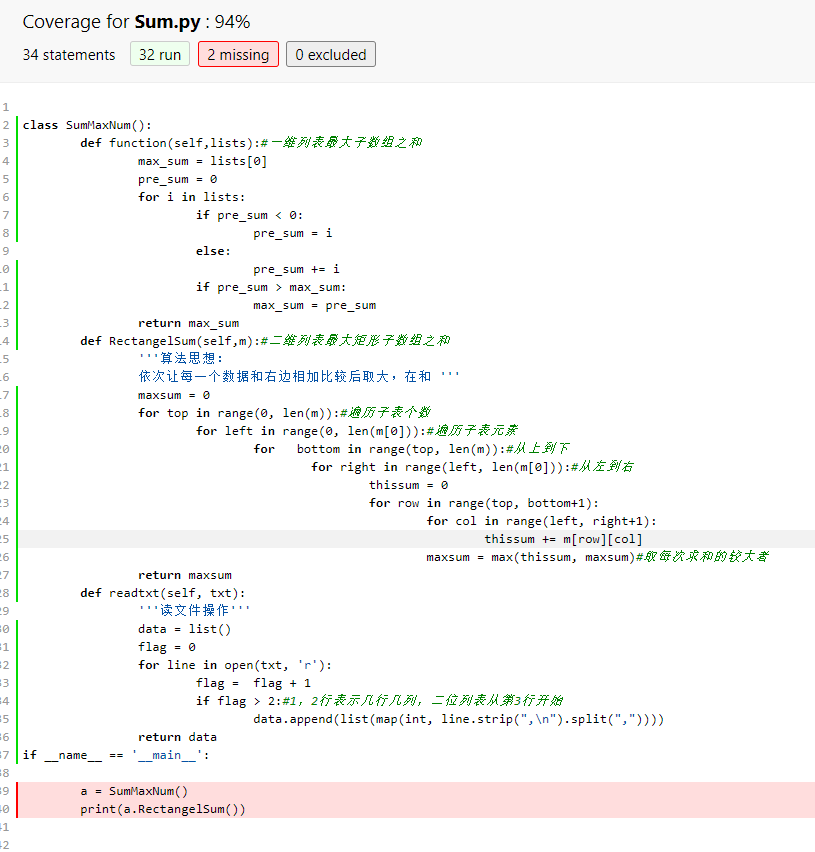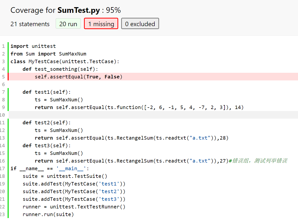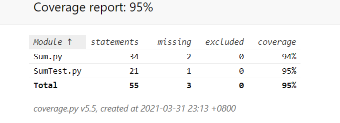 由结果可以得知,执行的SumTest.py文件,代码覆盖率是95%