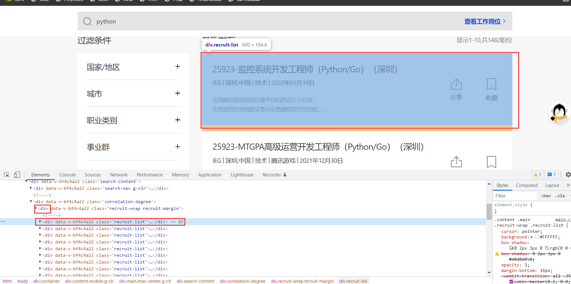要抓取的内容在大div class="recruit-wrap recruit-margin"下的div里面