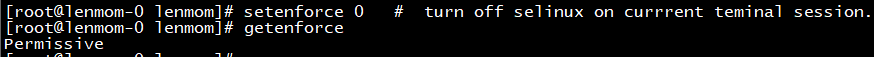 sed -i 's@SELINUX=enforcing@SELINUX=disabled@g' /etc/selinux/config #turn off selinux permanently setenforce 0 # turn off selinux on currrent teminal session. getenforce
