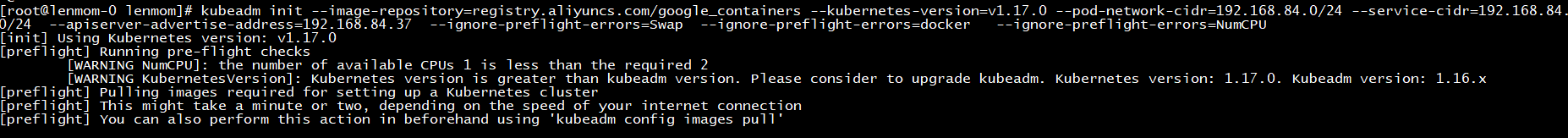 [root@lenmom-0 lenmom]# kubeadm init --image-repository=registry.aliyuncs.com/google_containers --kubernetes-version=v1.17.0 --pod-network-cidr=192.168.84.0/24 --service-cidr=192.168.84.0/24 --apiserver-advertise-address=192.168.84.37 --ignore-preflight-errors=Swap --ignore-preflight-errors=docker --ignore-preflight-errors=NumCPU [init] Using Kubernetes version: v1.17.0 [preflight] Running pre-flight checks [WARNING NumCPU]: the number of available CPUs 1 is less than the required 2 [WARNING KubernetesVersion]: Kubernetes version is greater than kubeadm version. Please consider to upgrade kubeadm. Kubernetes version: 1.17.0. Kubeadm version: 1.16.x [preflight] Pulling images required for setting up a Kubernetes cluster [preflight] This might take a minute or two, depending on the speed of your internet connection [preflight] You can also perform this action in beforehand using 'kubeadm config images pull' error execution phase preflight: [preflight] Some fatal errors occurred: [ERROR ImagePull]: failed to pull image registry.aliyuncs.com/google_containers/kube-apiserver:v1.17.0: output: Error response from daemon: Get https://registry.aliyuncs.com/v2/google_containers/kube-apiserver/manifests/v1.17.0: Get https://dockerauth.cn-hangzhou.aliyuncs.com/auth?scope=repository%3Agoogle_containers%2Fkube-apiserver%3Apull&service=registry.aliyuncs.com%3Acn-hangzhou%3A26842: dial tcp: lookup dockerauth.cn-hangzhou.aliyuncs.com on 192.168.84.33:53: read udp 192.168.84.37:54293->192.168.84.33:53: i/o timeout , error: exit status 1 [ERROR ImagePull]: failed to pull image registry.aliyuncs.com/google_containers/kube-controller-manager:v1.17.0: output: Error response from daemon: Get https://registry.aliyuncs.com/v2/google_containers/kube-controller-manager/manifests/v1.17.0: Get https://dockerauth.cn-hangzhou.aliyuncs.com/auth?scope=repository%3Agoogle_containers%2Fkube-controller-manager%3Apull&service=registry.aliyuncs.com%3Acn-hangzhou%3A26842: dial tcp: lookup dockerauth.cn-hangzhou.aliyuncs.com on 192.168.84.33:53: read udp 192.168.84.37:46837->192.168.84.33:53: i/o timeout , error: exit status 1 [ERROR ImagePull]: failed to pull image registry.aliyuncs.com/google_containers/kube-scheduler:v1.17.0: output: Error response from daemon: Get https://registry.aliyuncs.com/v2/google_containers/kube-scheduler/manifests/v1.17.0: Get https://dockerauth.cn-hangzhou.aliyuncs.com/auth?scope=repository%3Agoogle_containers%2Fkube-scheduler%3Apull&service=registry.aliyuncs.com%3Acn-hangzhou%3A26842: dial tcp: lookup dockerauth.cn-hangzhou.aliyuncs.com on 192.168.84.33:53: read udp 192.168.84.37:32815->192.168.84.33:53: i/o timeout , error: exit status 1 [ERROR ImagePull]: failed to pull image registry.aliyuncs.com/google_containers/kube-proxy:v1.17.0: output: Error response from daemon: Get https://registry.aliyuncs.com/v2/google_containers/kube-proxy/manifests/v1.17.0: Get https://dockerauth.cn-hangzhou.aliyuncs.com/auth?scope=repository%3Agoogle_containers%2Fkube-proxy%3Apull&service=registry.aliyuncs.com%3Acn-hangzhou%3A26842: dial tcp: lookup dockerauth.cn-hangzhou.aliyuncs.com on 192.168.84.33:53: read udp 192.168.84.37:55244->192.168.84.33:53: i/o timeout , error: exit status 1 [ERROR ImagePull]: failed to pull image registry.aliyuncs.com/google_containers/pause:3.1: output: Error response from daemon: Get https://registry.aliyuncs.com/v2/google_containers/pause/manifests/3.1: Get https://dockerauth.cn-hangzhou.aliyuncs.com/auth?scope=repository%3Agoogle_containers%2Fpause%3Apull&service=registry.aliyuncs.com%3Acn-hangzhou%3A26842: dial tcp: lookup dockerauth.cn-hangzhou.aliyuncs.com on 192.168.84.33:53: read udp 192.168.84.37:55865->192.168.84.33:53: i/o timeout , error: exit status 1 [ERROR ImagePull]: failed to pull image registry.aliyuncs.com/google_containers/etcd:3.3.15-0: output: Error response from daemon: Get https://registry.aliyuncs.com/v2/google_containers/etcd/manifests/3.3.15-0: Get https://dockerauth.cn-hangzhou.aliyuncs.com/auth?scope=repository%3Agoogle_containers%2Fetcd%3Apull&service=registry.aliyuncs.com%3Acn-hangzhou%3A26842: dial tcp: lookup dockerauth.cn-hangzhou.aliyuncs.com on 192.168.84.33:53: read udp 192.168.84.37:56733->192.168.84.33:53: i/o timeout , error: exit status 1 [ERROR ImagePull]: failed to pull image registry.aliyuncs.com/google_containers/coredns:1.6.2: output: Error response from daemon: Get https://registry.aliyuncs.com/v2/google_containers/coredns/manifests/1.6.2: Get https://dockerauth.cn-hangzhou.aliyuncs.com/auth?scope=repository%3Agoogle_containers%2Fcoredns%3Apull&service=registry.aliyuncs.com%3Acn-hangzhou%3A26842: dial tcp: lookup dockerauth.cn-hangzhou.aliyuncs.com on 192.168.84.33:53: read udp 192.168.84.37:39608->192.168.84.33:53: i/o timeout , error: exit status 1 [preflight] If you know what you are doing, you can make a check non-fatal with `--ignore-preflight-errors=...` To see the stack trace of this error execute with --v=5 or higher
