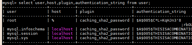 select user,host,plugin,authentication_string from user;