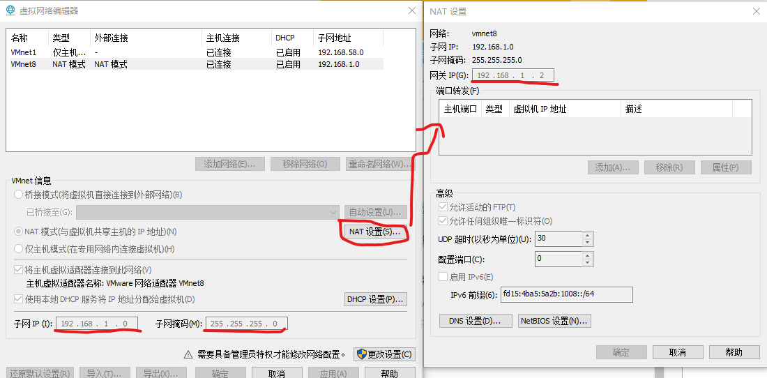 编辑->虚拟网络编辑器->更改设置->选中VM8>点击NAT设置,设置默认网关为192.168.1.2