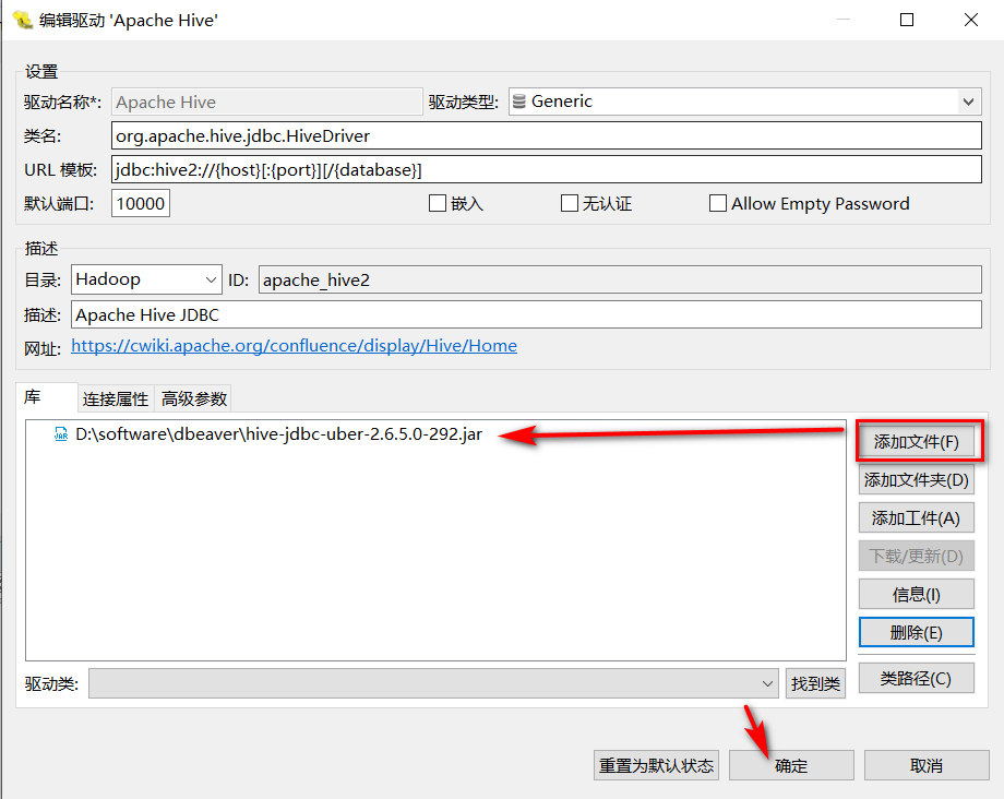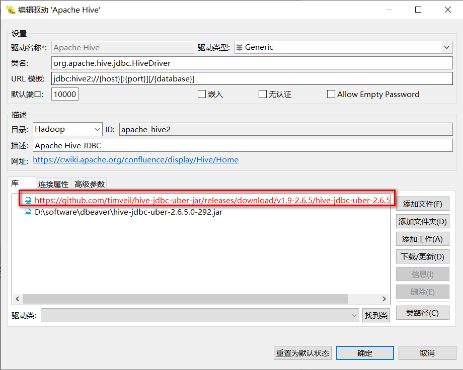 可以移除原有的默认自带的驱动配置,然后添加自己的:hive-jdbc-uber-2.6.5.0-292.jar,我这直接将jar驱动放入到dbeaver目录下面的,尽量不要有中文、空格路径。